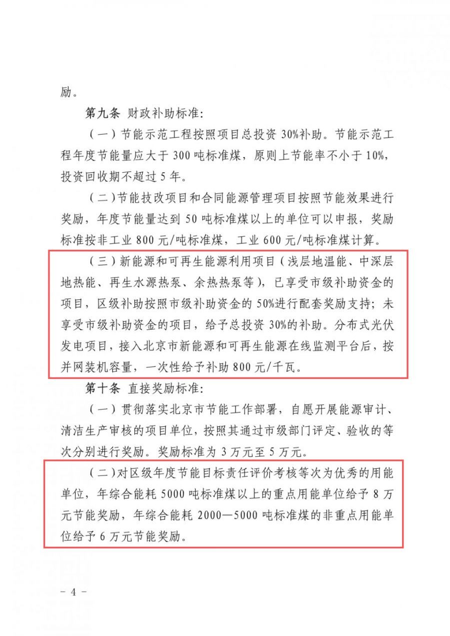 通知明確:新能源和可再生能源利用項(xiàng)目已享受市級(jí)補(bǔ)助資金的項(xiàng)目,區(qū)級(jí)補(bǔ)助按照市級(jí)補(bǔ)助資金的50%進(jìn)行配套獎(jiǎng)勵(lì)支持;未享受市級(jí)補(bǔ)助資金的項(xiàng)目,給予總投資30%的補(bǔ)助。分布式光伏發(fā)電項(xiàng)目,接入北京市新能源和可再生能源在線監(jiān)測(cè)平臺(tái)后,接并網(wǎng)裝機(jī)容量,一次性給予補(bǔ)助800元/千瓦