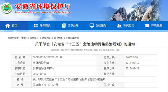 為貫徹落實《安徽省土壤污染防治工作方案》,進一步加強危險廢物污染防治工作,改善環境質量,防范環境風險,安徽省環保廳、省發展改革委、省經濟和信息化委、省衛生計生委、省教育廳、省科技廳聯合編制了《安徽省“十三五”危險廢物污染防治規劃》(以下簡稱《規劃》)。