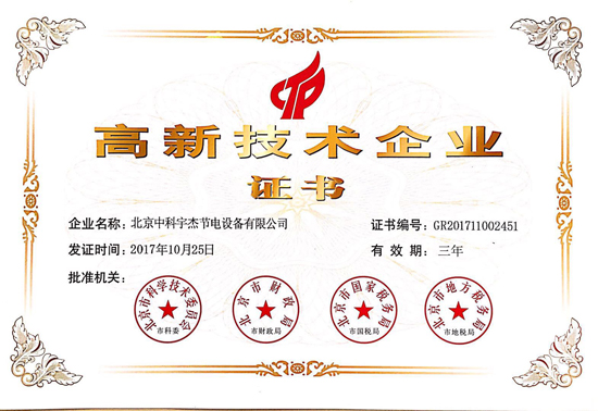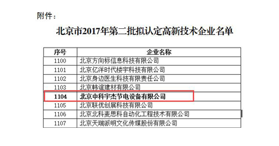 近日,國家高新技術企業(yè)認定管理工作網(wǎng)發(fā)布了《關于公示豐臺園2017年第二批擬認定高新技術企業(yè)名單的通知》,北京中科宇杰節(jié)電設備有限公司通過認證,榮獲“國家高新技術企業(yè)”的殊榮。