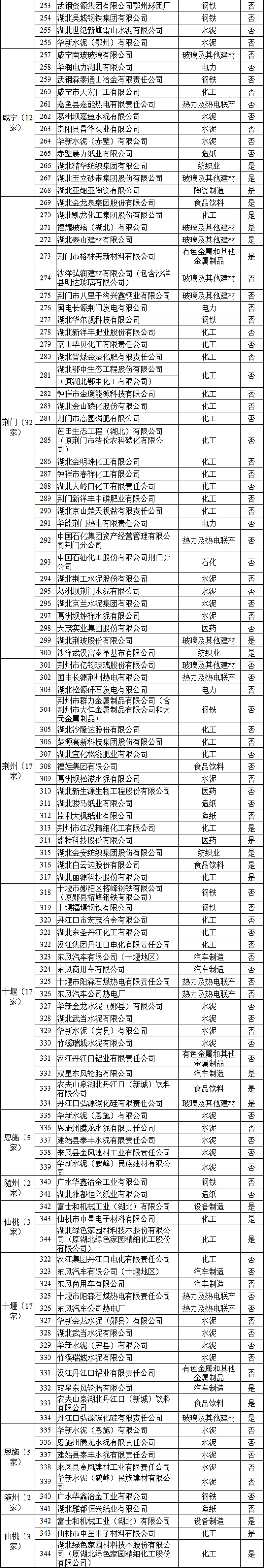湖北省發(fā)改 委日前印發(fā)了《湖北省2017年碳排放權(quán)配額分配方案的通知》,根據(jù)對湖北省2014—2016年任一年綜合能耗1萬噸標準煤及以上的工業(yè)企業(yè)碳排放核查的結(jié)果,確定344家企業(yè)作為2017年納入碳排放配額管理的企業(yè)(以下簡稱“納入企業(yè)”),涉及電力、鋼鐵、水泥、化工等15個行業(yè)。詳情如下: