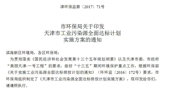 為貫徹落實黨的十八屆五中、六中全會精神,按照《國民經濟和社會發展第十三個五年規劃綱要》、《國務院辦公廳關于印發控制污染物排放許可制實施方案的通知》(國辦發﹝2016﹞81號)以及天津市委、市政府“美麗天津˙一號工程”的要求,根據環保部《關于實施工業污染源全面達標排放計劃的通知》(環環監﹝2016﹞172號),為加大環境保護和生態文明建設力度,積極推進供給側結構性改革,推進天津市實施工業污染源全面達標排放計劃,特制定本方案。