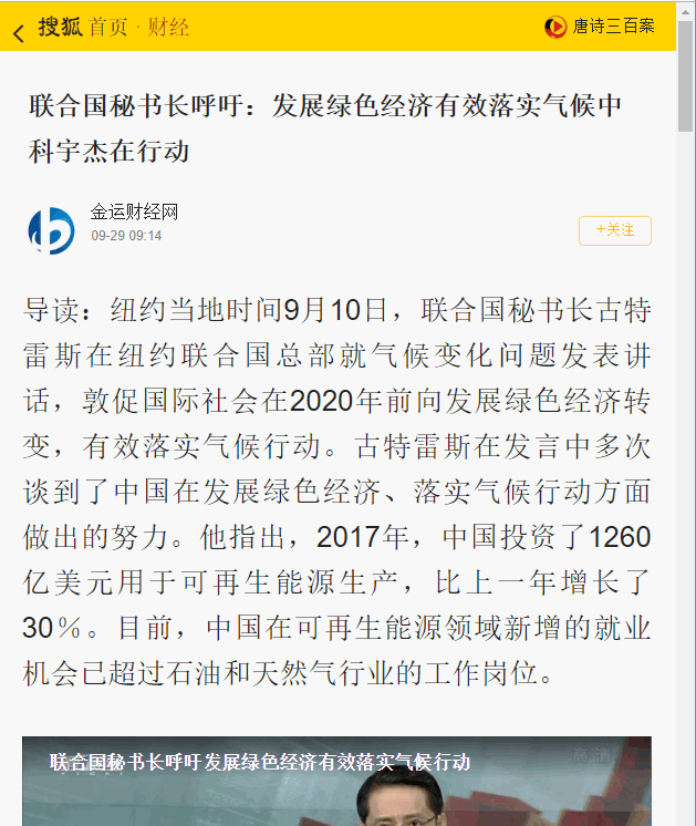 導(dǎo)讀:紐約當(dāng)?shù)貢r(shí)間9月10日,聯(lián)合國秘書長古特雷斯在紐約聯(lián)合國總部就氣候變化問題發(fā)表講話,敦促國際社會(huì)在2020年前向發(fā)展綠色經(jīng)濟(jì)轉(zhuǎn)變,有效落實(shí)氣候行動(dòng)。古特雷斯在發(fā)言中多次談到了中國在發(fā)展綠色經(jīng)濟(jì)、落實(shí)氣候行動(dòng)方面做出的努力。他指出,2017年,中國投資了1260億美元用于可再生能源生產(chǎn),比上一年增長了30%。目前,中國在可再生能源領(lǐng)域新增的就業(yè)機(jī)會(huì)已超過石油和天然氣行業(yè)的工作崗位。
