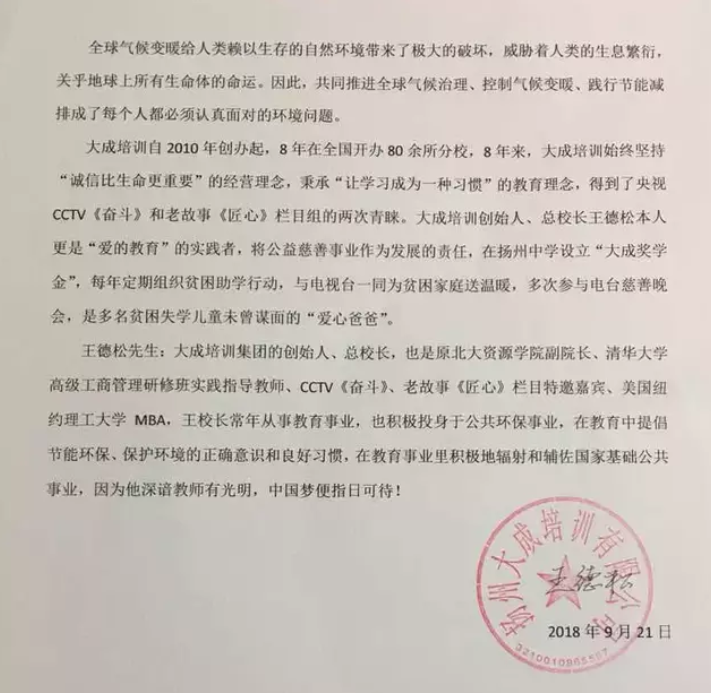王德松先生:大成培訓(xùn)集團(tuán)的創(chuàng)始人、總校長,也是原北大資源學(xué)院副院長、清華大學(xué)高級(jí)工商管理研修班實(shí)踐指導(dǎo)教師、CCTV《奮斗》、老故事《匠心》欄目特邀嘉賓、美國紐約理工大學(xué)MBA。王校長常年從事教育事業(yè),也積極投身于公共環(huán)保事業(yè),他常常教導(dǎo)學(xué)生要注意節(jié)能環(huán)保、要保護(hù)我們生存環(huán)境。他在教育事業(yè)里積極地輻射和輔佐國家基礎(chǔ)公共事業(yè),因?yàn)樗钪O教師有光明,中國夢便指日可待!